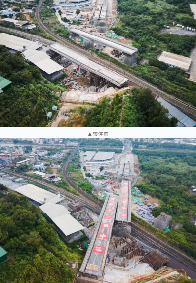 當(dāng)天7時(shí)04分,轉(zhuǎn)體橋梁開始轉(zhuǎn)體,經(jīng)過44分鐘施工,成功完成高空“二人轉(zhuǎn)”,為下一步順利實(shí)現(xiàn)通車運(yùn)營(yíng)奠定堅(jiān)實(shí)基礎(chǔ)。轉(zhuǎn)體橋上跨既有漳龍線、龍東線及煤場(chǎng)專用線3條鐵路貨運(yùn)營(yíng)業(yè)線,距離營(yíng)業(yè)線最近距離僅5.9米,施工難度大,危險(xiǎn)系數(shù)高。
