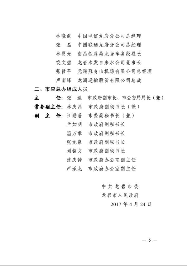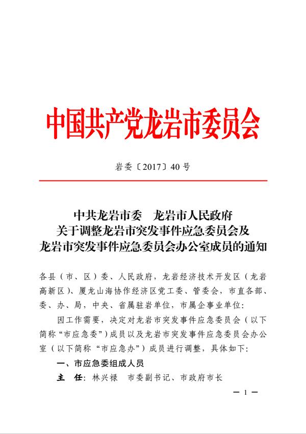 市委關(guān)于調(diào)整龍巖市突發(fā)事件應急委員會及龍巖市突發(fā)事件應急委員會辦公室成員的通知(巖委【2017】40號)