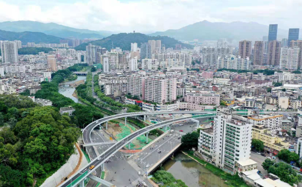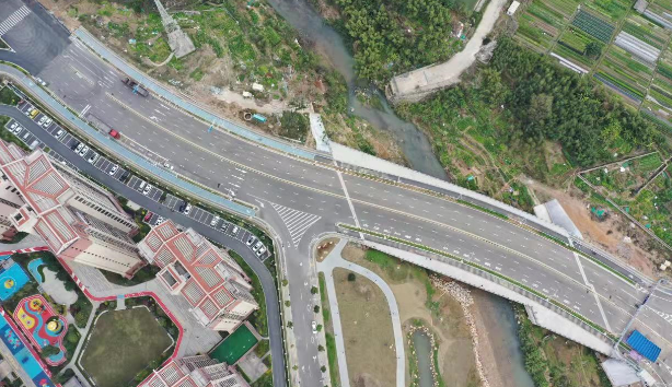 羅橋節(jié)點(diǎn)改造提升工程2019年11月開(kāi)工建設(shè),2021年8月建成通車(chē)。該項(xiàng)目沿北環(huán)西路、龍興路設(shè)置南北分離式雙向四車(chē)道高架,南側(cè)接龍興路,北側(cè)接現(xiàn)狀北環(huán)西路,高架靠東側(cè)布置(緊貼烈士陵園),橋梁總長(zhǎng)約1140米,凈寬約7.7米;在雙洋路、龍川北路、北環(huán)西路設(shè)置人行天橋,與山體步道銜接,以完善慢行系統(tǒng);在烈士陵園山體下采用明挖回填方式設(shè)置框涵,長(zhǎng)度約225米,凈寬10.75米。工程投資1.4億元。